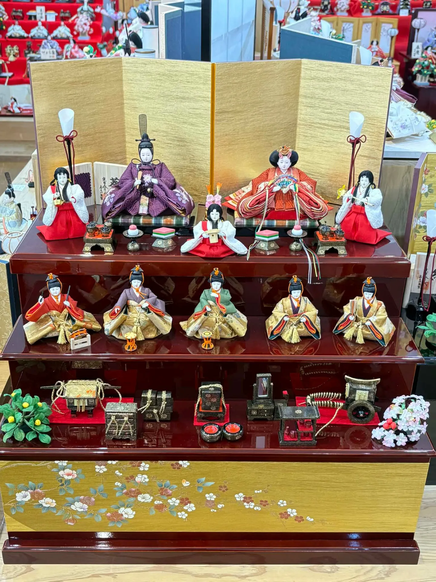 特に三段収納飾りや十人飾りは、三人官女や五人囃子が揃い、家族全員で節句の賑やかな雰囲気を楽しめます。金屏風や木製の道具が空間を一層華やかに彩り、お子さまの健やかな成長を願う気持ちを形にできます。