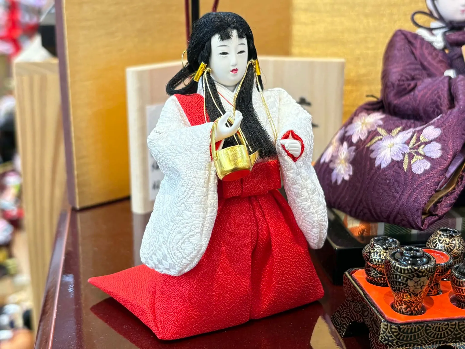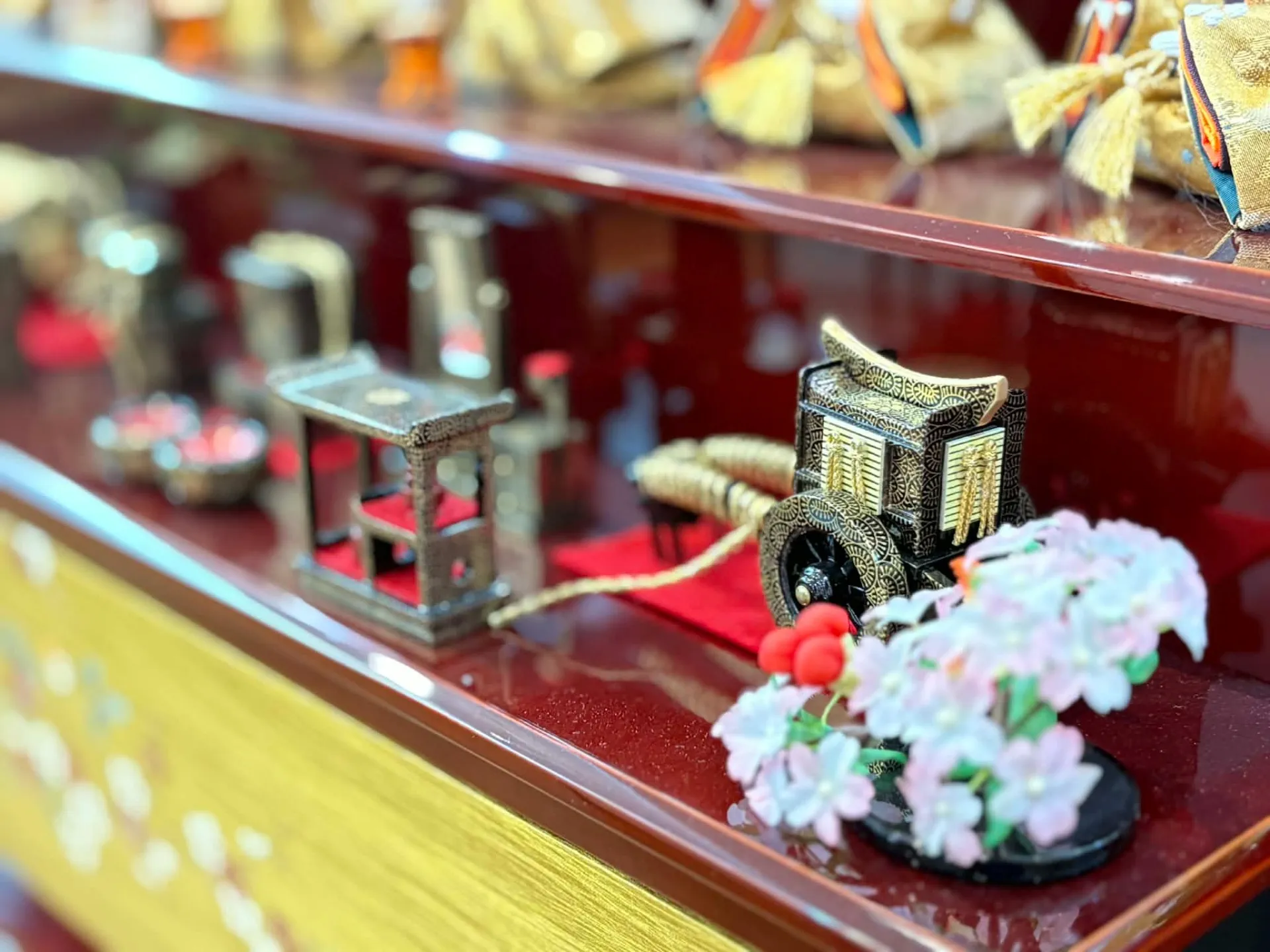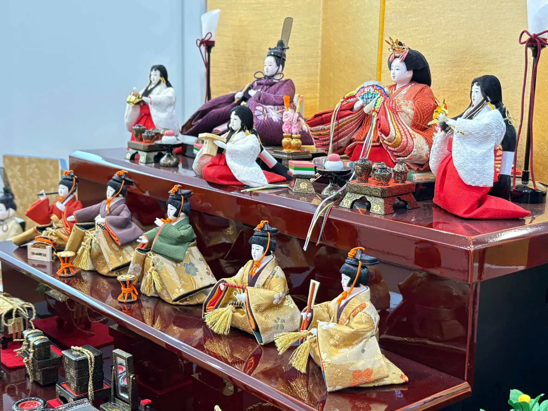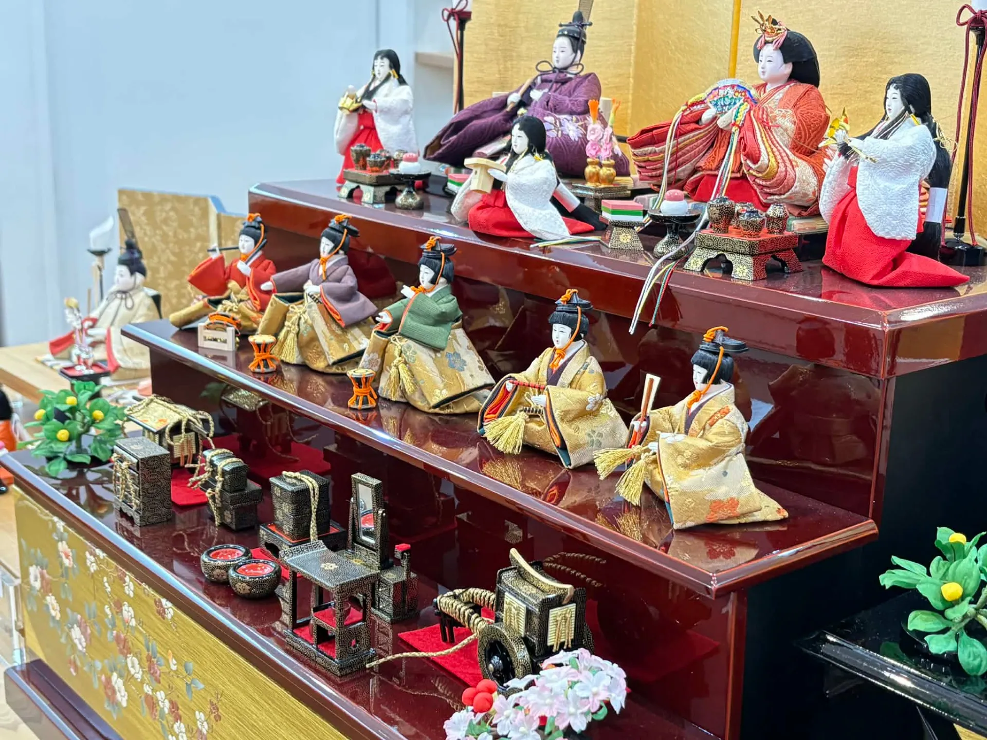 金屏風や細部にこだわった木製道具など、華やかさと格調高さを両立している点も特徴です。特に「有職雲立涌京刺繍桜」衣裳は、伝統的な文様を活かしつつ、華やかな印象を与えます。現代の住宅事情に合わせてコンパクトな収納飾りも増え、飾りやすさと美しさのバランスが向上しています。