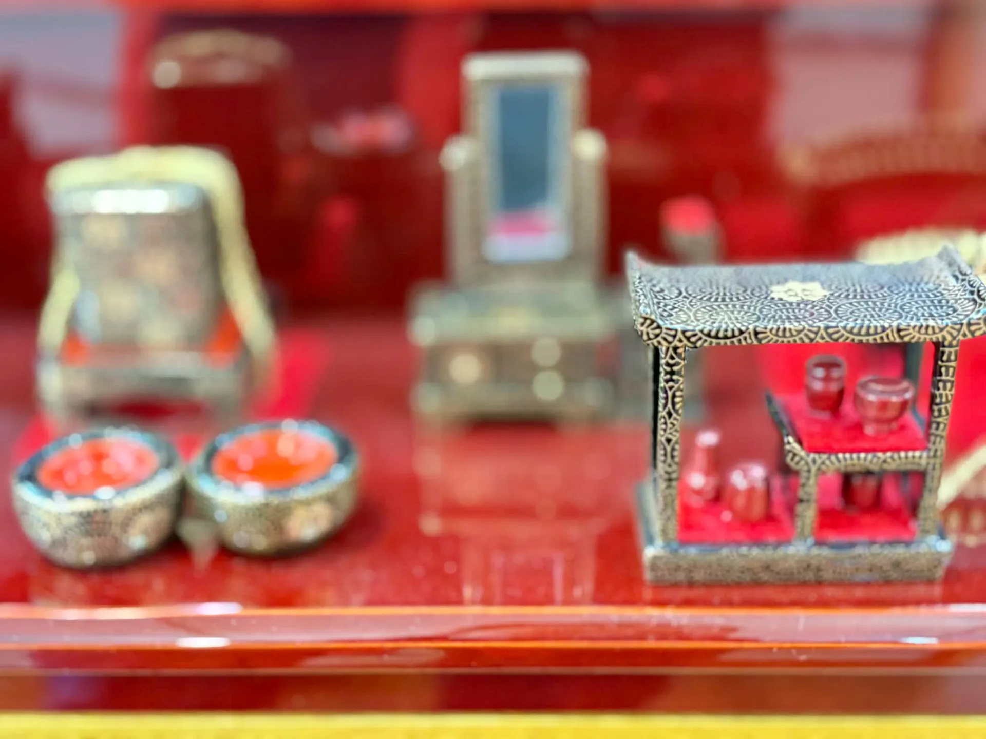 柴田家千代の三段収納飾りは、正絹を使った上質な衣裳や、金箔を施した金屏風など、細部に至るまで作家のこだわりが光ります。特に「有職雲立涌京刺繍桜」衣裳を纏った殿姫の美しさや、木製の嫁入り道具のフルセットなど、実用性だけでなく見た目の豪華さも兼ね備えています。