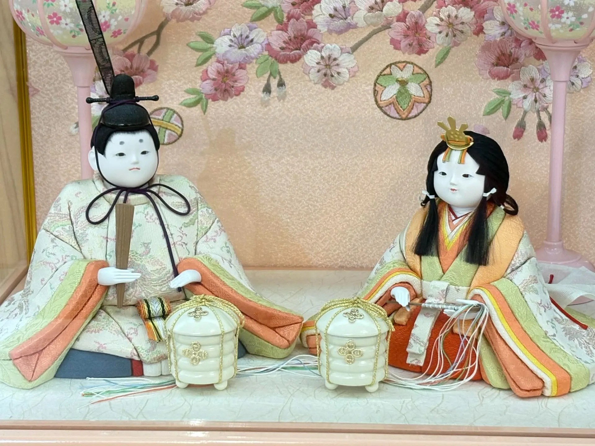 飾り付けの際は、アクリル足付きの飾り台や、四曲枠なし屏風を活かして、リビングや玄関など身近な場所に設置することで、日常の中に節句の華やかさをプラスできます。桜橘や玉台、燭台などの伝統的な小道具もセットされているため、細部まで美しく演出可能です。