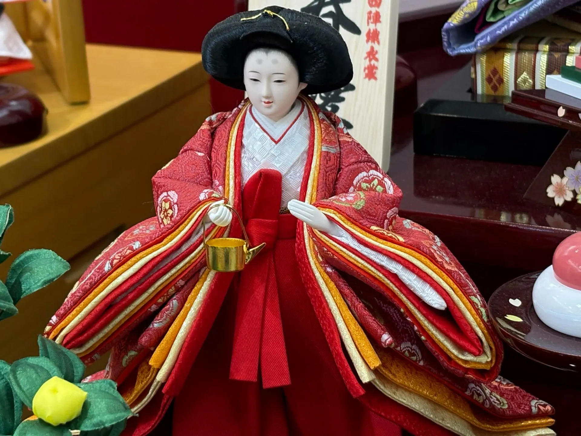 雛人形を飾る意味は、単に春の訪れを祝うだけでなく、子どもの健やかな成長や良縁を祈ることにあります。特に三段五人飾りでは、親王と三人官女が並び、結婚式を模した華やかな場面が再現されています。三人官女の持つ銚子は、現代の結婚式の三々九度にも使われる道具で、良縁への願いが込められています。