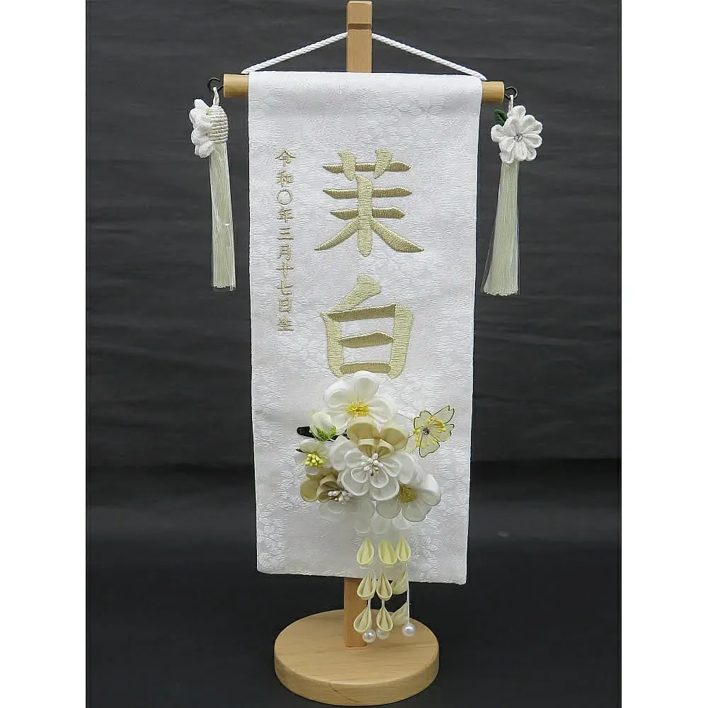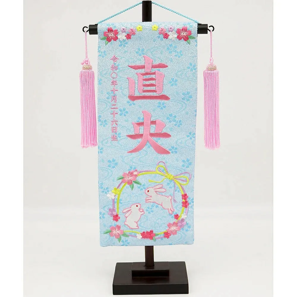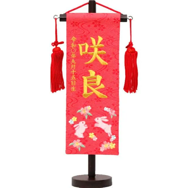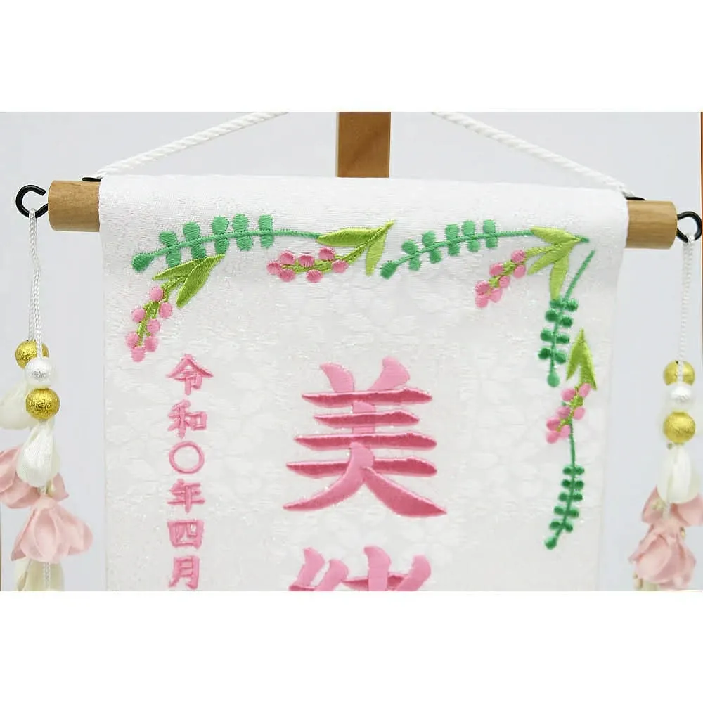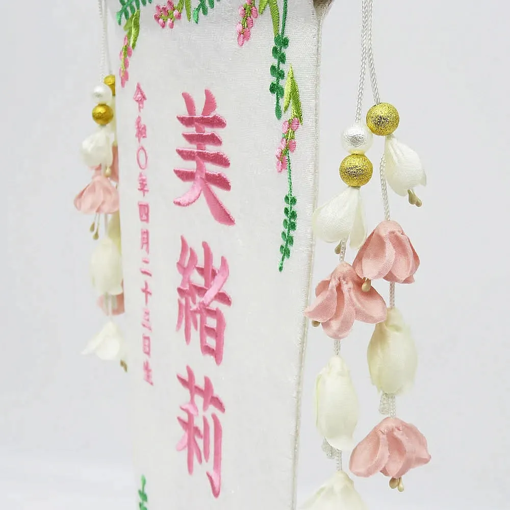 祝いの場では、雛人形の横に名前旗を添えることで、より個性や家族の願いを表現できます。名前旗には桜や桃、うさぎ、鞠など縁起の良いデザインが多く、刺繍やプリントでお子様の名前や生年月日が入れられるのも魅力です。