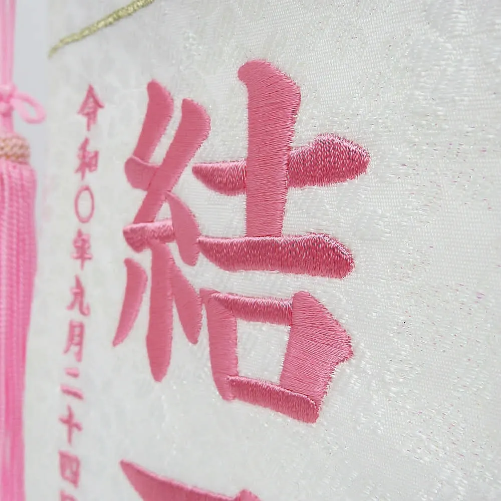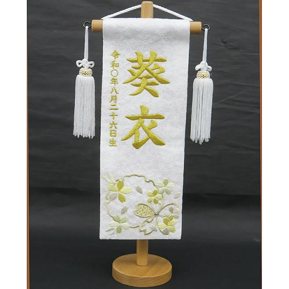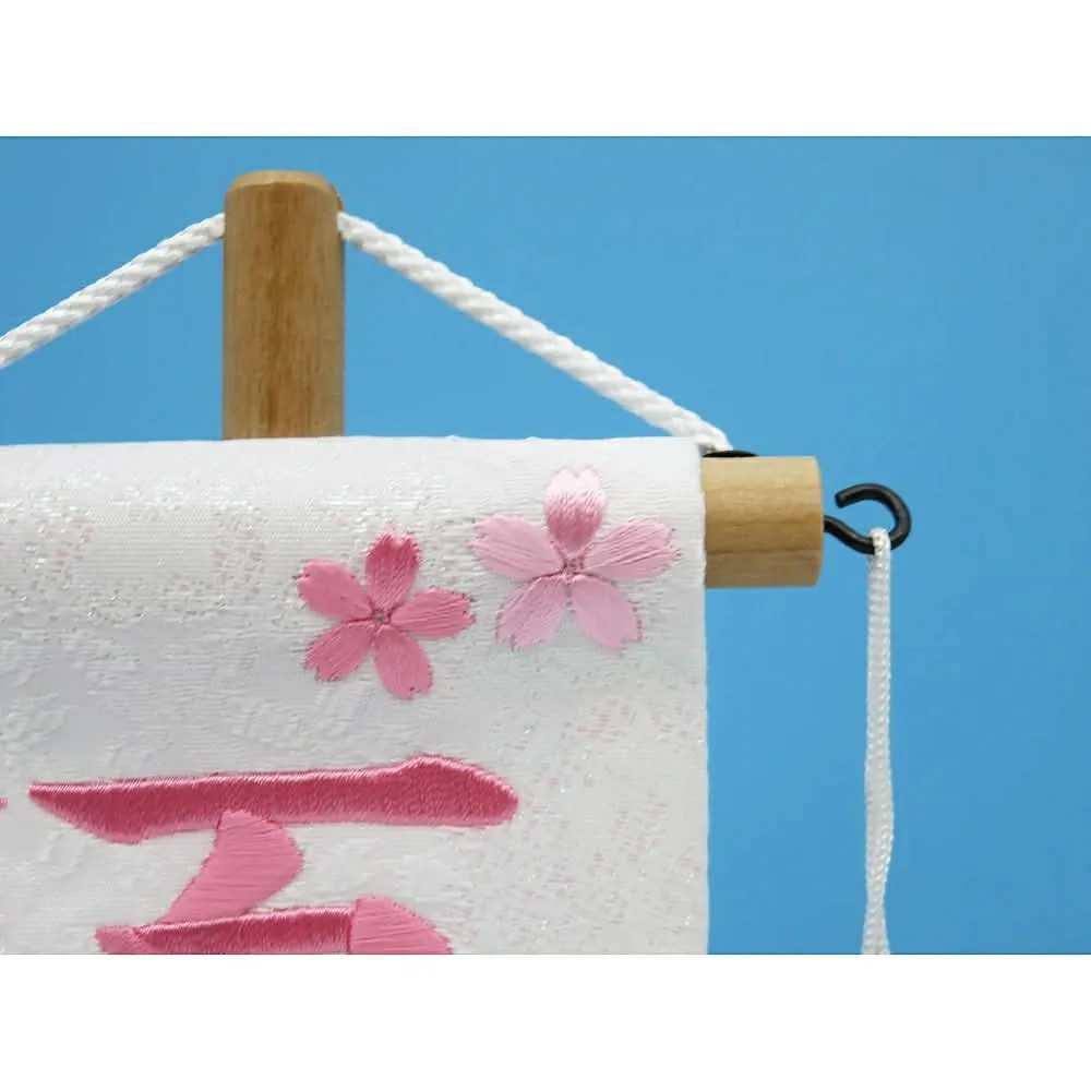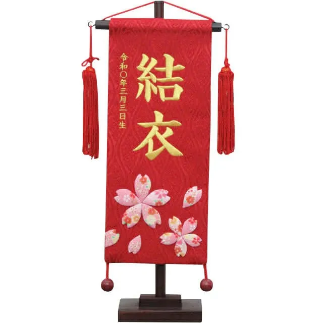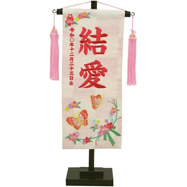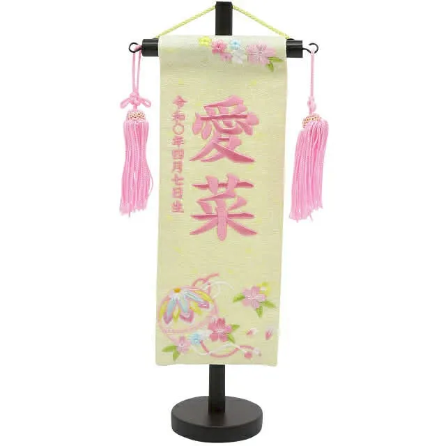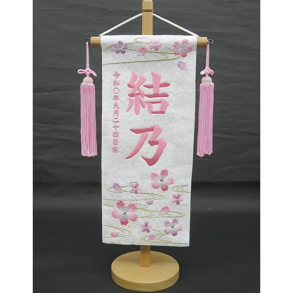 祝いの場では、雛人形の横に名前旗を添えることで、より個性や家族の願いを表現できます。名前旗には桜や桃、うさぎ、鞠など縁起の良いデザインが多く、刺繍やプリントでお子様の名前や生年月日が入れられるのも魅力です。