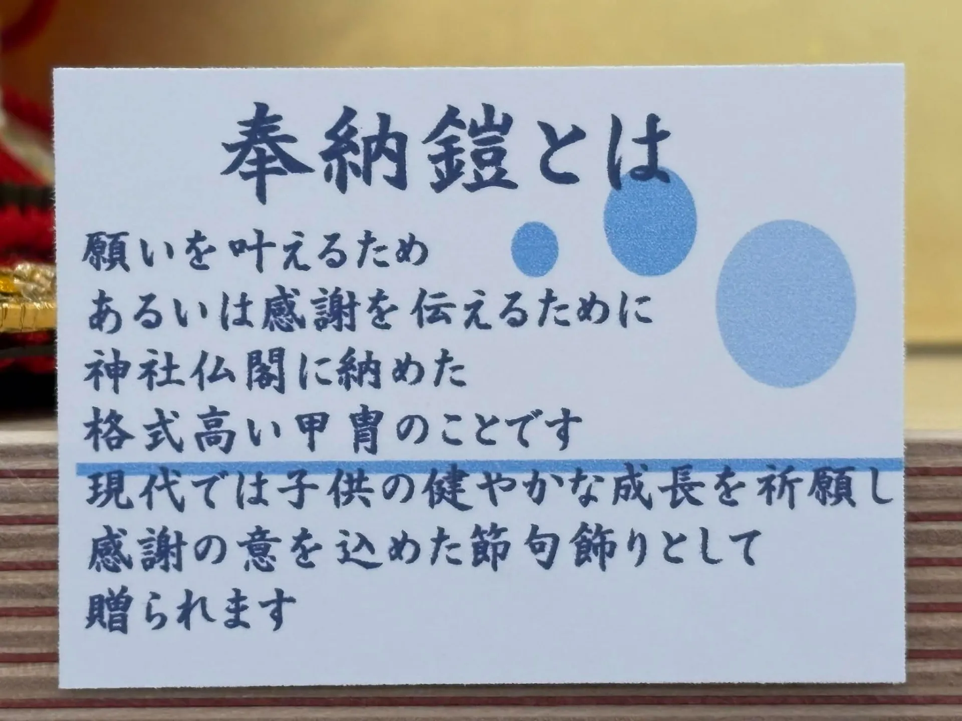 奉納鎧は、元来「願いが叶う」「神の守護を得る」といった縁起の良さで古くから親しまれてきました。現代においても、男児の健康や家族の幸せを祈る節句飾りとしての意味合いが受け継がれています。