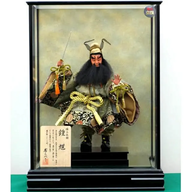 鍾馗の人形は、黒い帽子と立派な髭、降魔の剣を持つ力強い姿が特徴で、子どもを守る優しい神様として現代でも親しまれています。五月人形と一緒に飾ることで、より強い守護力を願い、家庭の平安やお子様の成長を祈る意味合いが深まります。