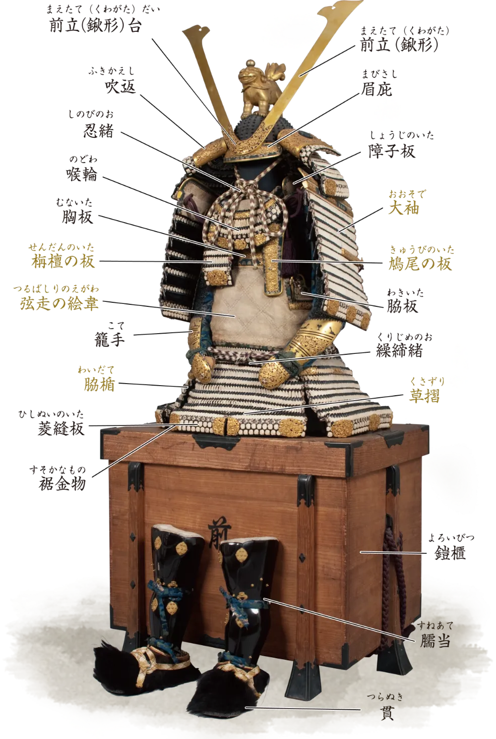 鎧・兜のパーツは、それぞれに明確な役割と美的工夫が施されています。大鎧では、大きな大袖が肩をしっかり守り、胸元の栴檀板や鳩尾板が身体の要所を防御。四角いシルエットが重厚感と格式を演出しています。一方、具足は体の動きを妨げない曲線的なフォルムで、籠手や臑当など手足まで防護するパーツが特徴です。