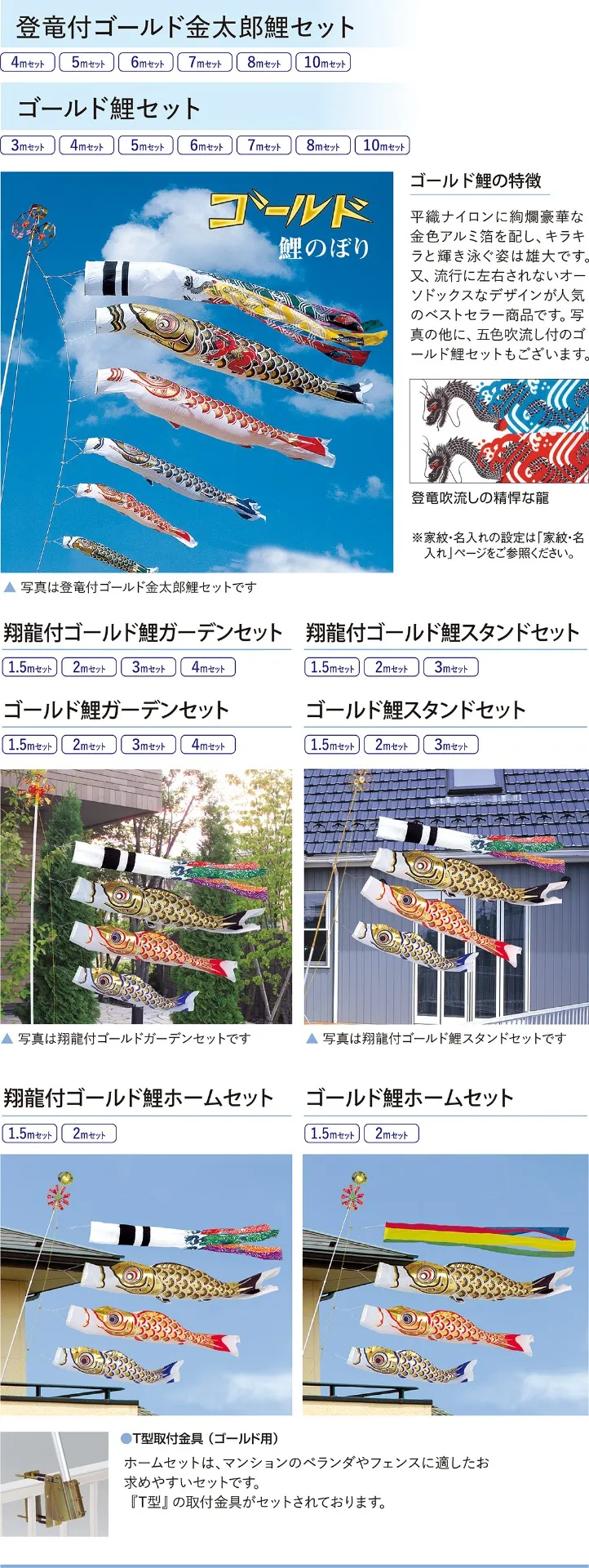 特に旭天竜のゴールド鯉セットは、豪華な金色の鯉と伝統的な五色吹流しが調和し、家族の願いを華やかに表現します。現代の住宅事情に合わせたコンパクトサイズやベランダ用も登場しており、マンションや戸建てでも無理なく設置が可能です。