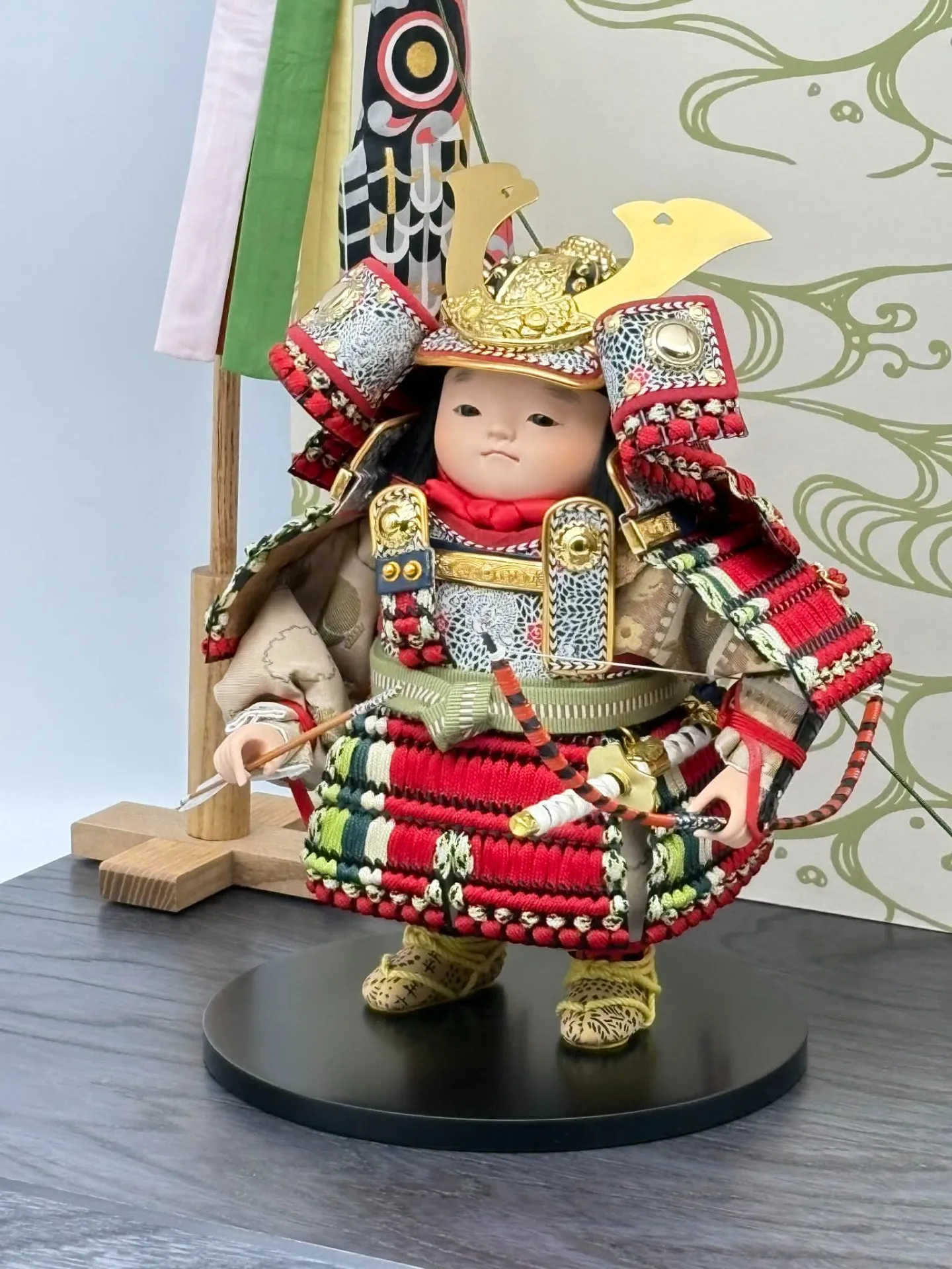 特に赤の褄取は、端午の節句を祝う場に華やかさを添えるだけでなく、勇ましさと気品を同時に表現できる点が人気です。細密な仕立てと、松崎幸一光ならではの柔和な表情との調和が、「若大将」としての存在感を一層高めています。初節句を迎えるご家庭にとって、こうした職人技の詰まった五月人形は、世代を超えて受け継がれる価値ある逸品となるでしょう。