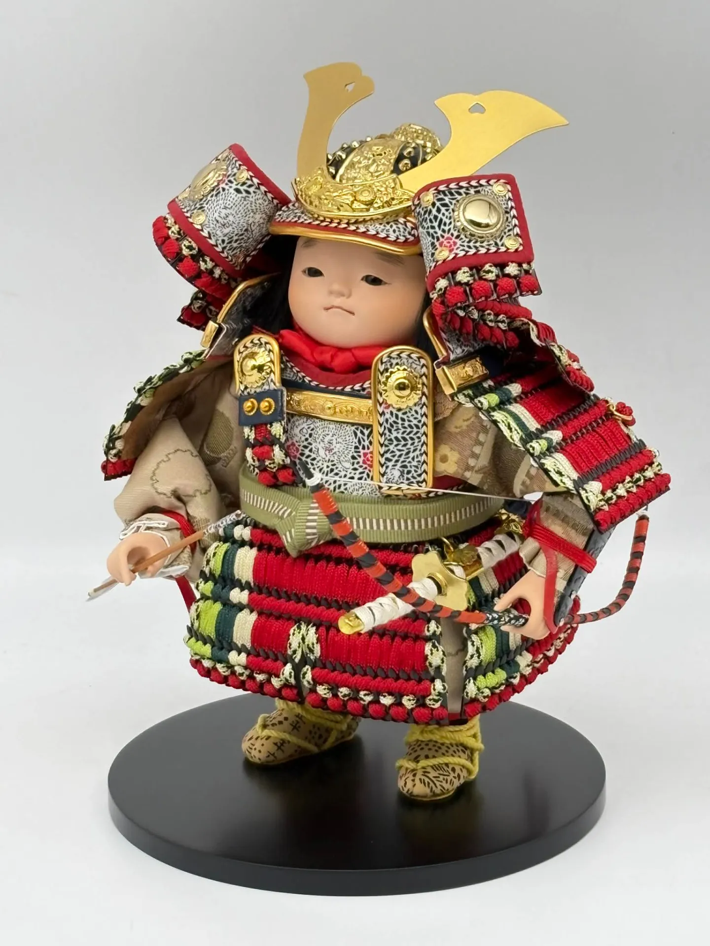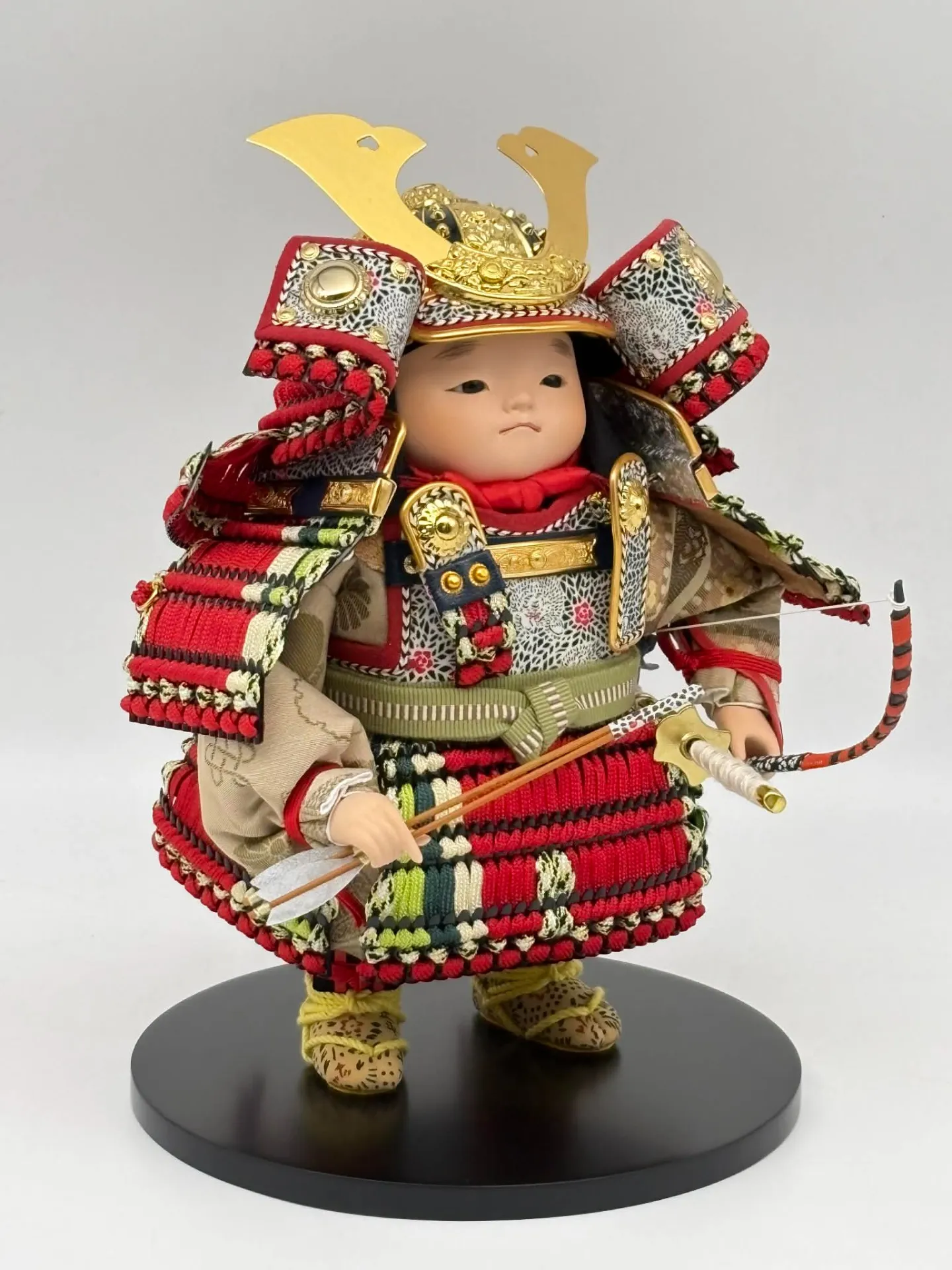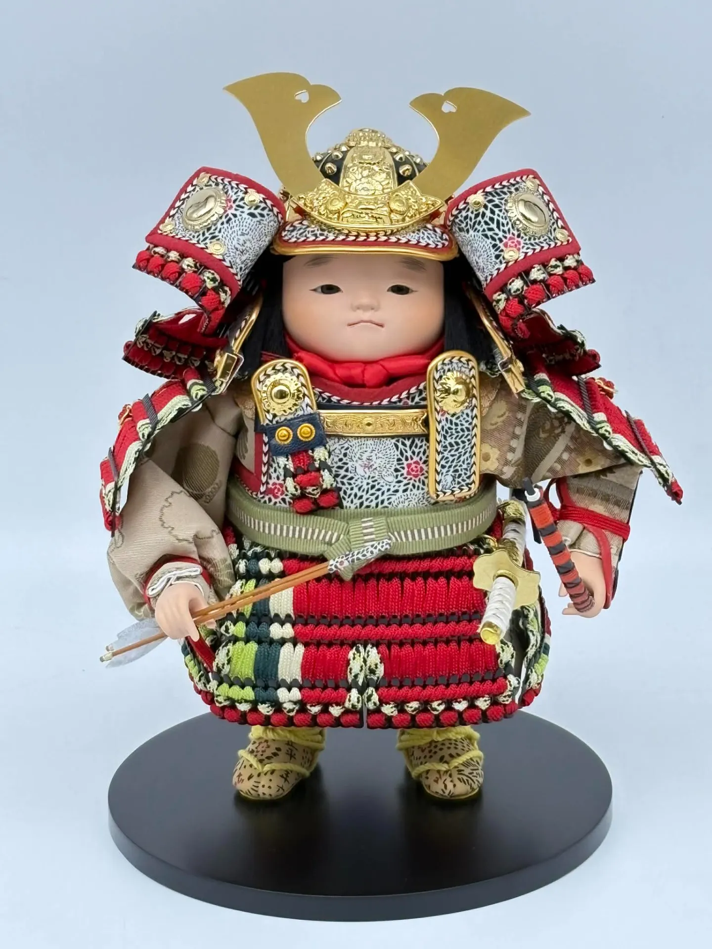 松崎幸一光の「鎧着若大将 悠」は、ふっくらとした頬やきゅっと結んだ口元といった幼い表情に、男の子の健やかな成長を願う力強さが込められています。凛々しさと愛らしさが共存する独特の顔立ちは、家族の希望や祈りを象徴するものです。