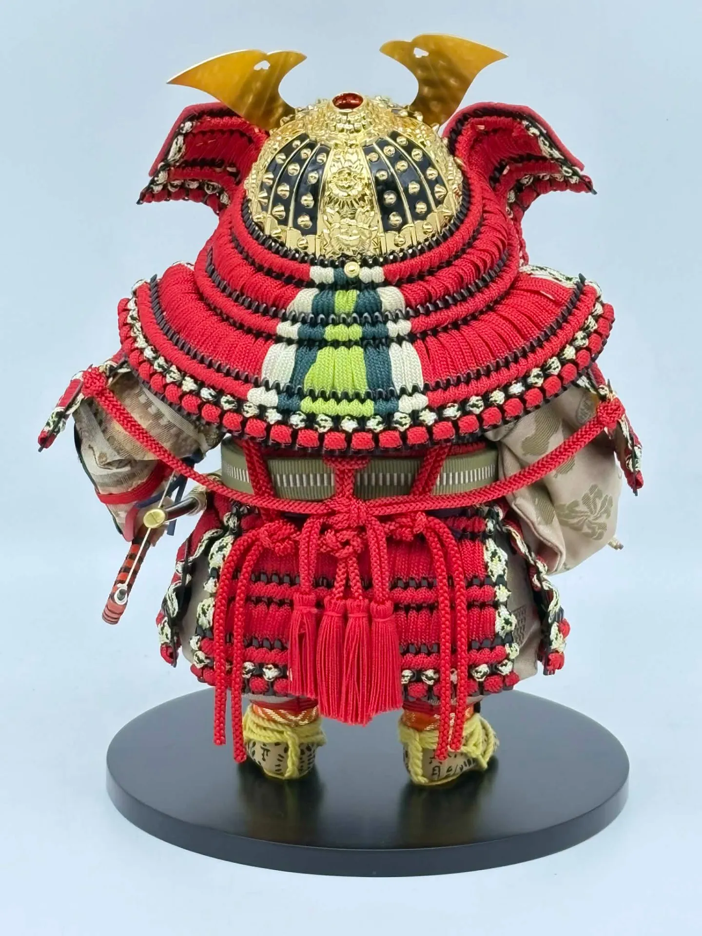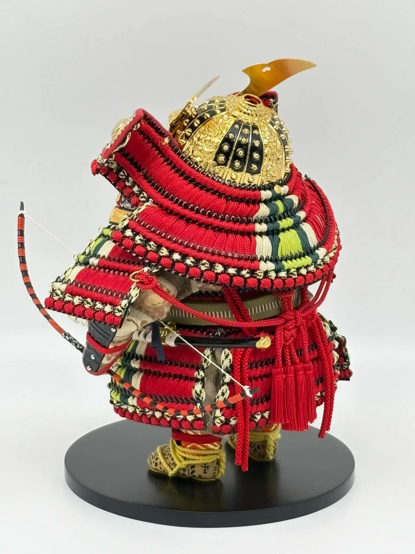 特に「赤の褄取威」は、黒の小札を基調に赤い糸でアクセントを加えた華やかな配色で、古来より武将に好まれた勇猛かつ優雅なスタイルです。端午の節句にふさわしい格式と気品を演出し、飾り台や屏風との組み合わせで一層存在感が際立ちます。