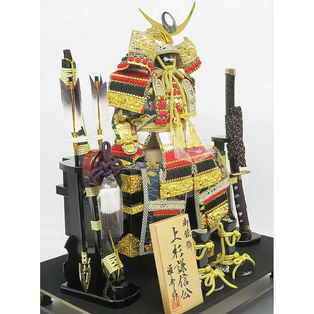 5号サイズの上杉謙信公鎧・兜は、コンパクトでありながらも細部まで精巧に作られている点が特徴です。「義」を重んじた武将として知られる上杉謙信公の前立て「日輪に三日月」は、子どもの誠実さや正義感の成長を願う気持ちが込められています。小さいながらも高級感があり、インテリアとしても美しく映えるのが魅力です。